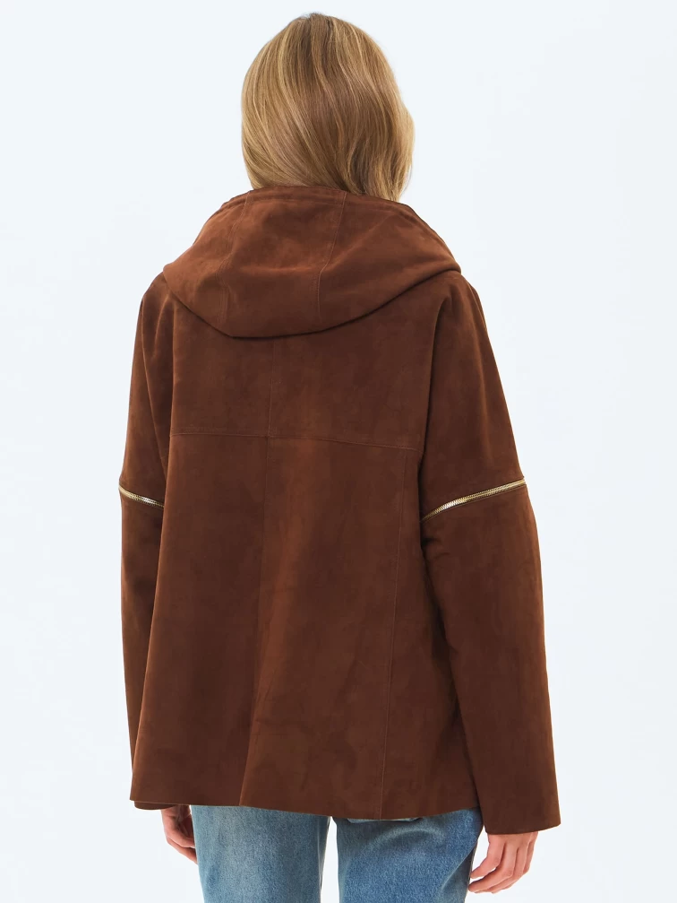 Эта модель может послужить не только как куртка, но и как отличным жакетом. Изделие выполнили из мягкой натуральной замши премиум класс. Комфортный свободный крой. Широкий рукав-трансформер. Глубокий капюшон регулируемый кулисками. Роль декора отдали нагрудным и боковым карманам. Застежка-крупная молния.