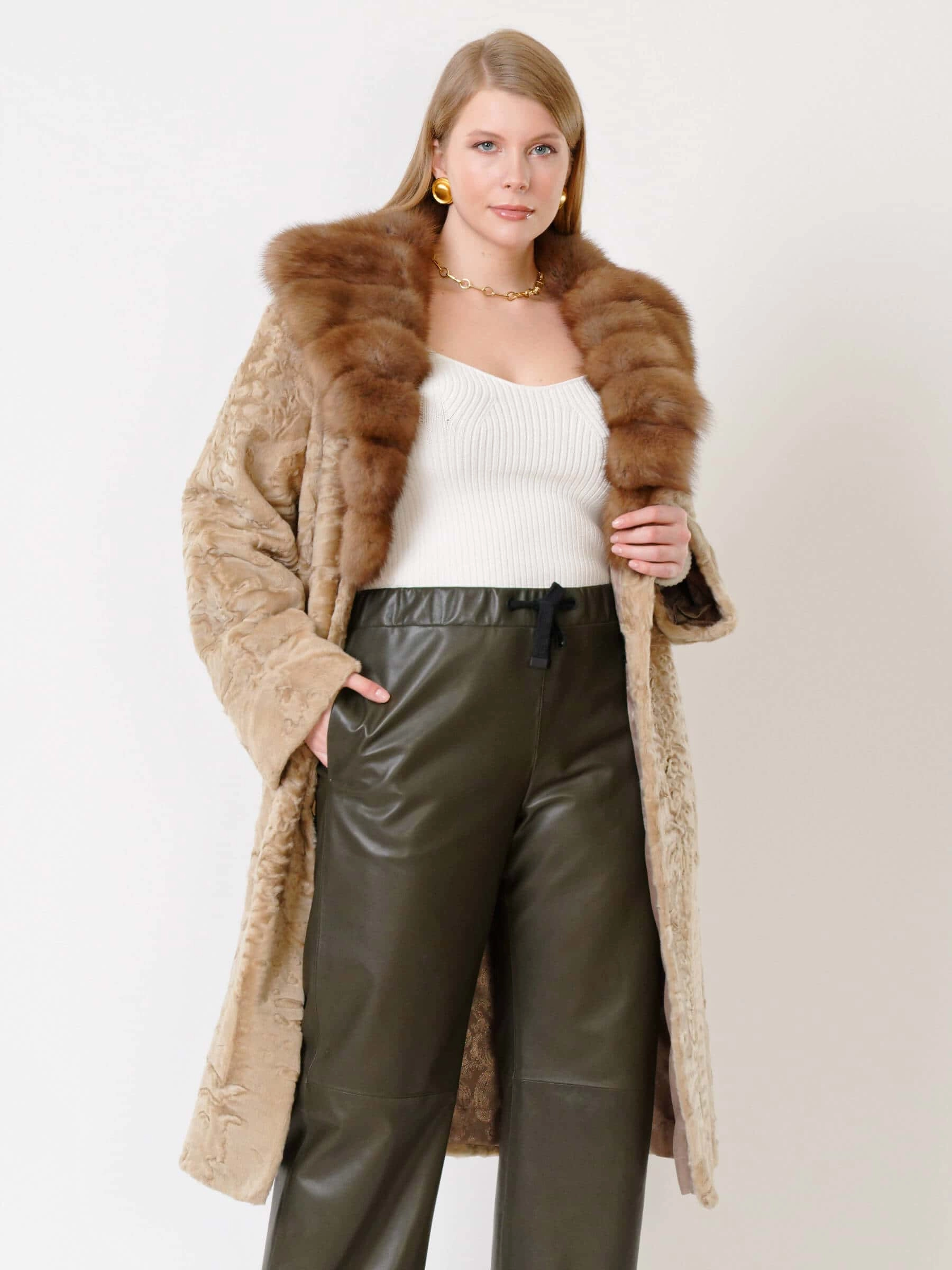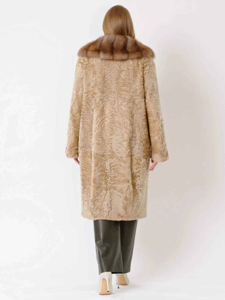 Пальто из афганской каракульчи в цвете сур. Точно подобранный рисунок. Высокое качество меха. Воротник из меха куницы. Ювелирный подбор шкурок по оттенку и структуре волоса. Аккуратная работа портных. Чёткая посадка по фигуре.