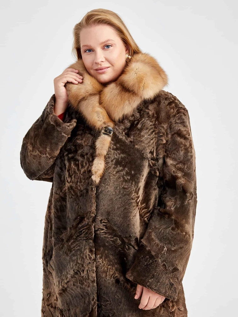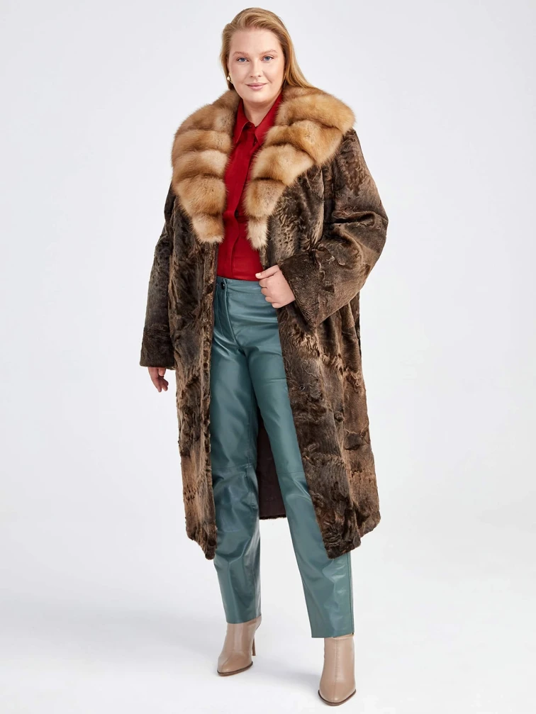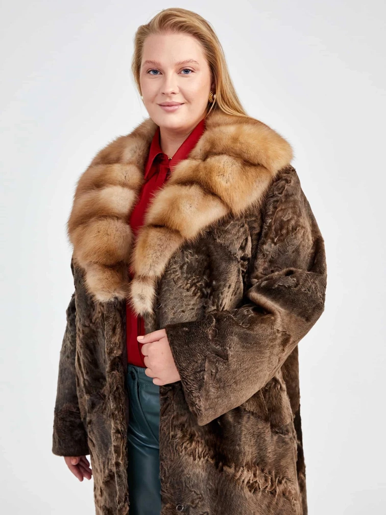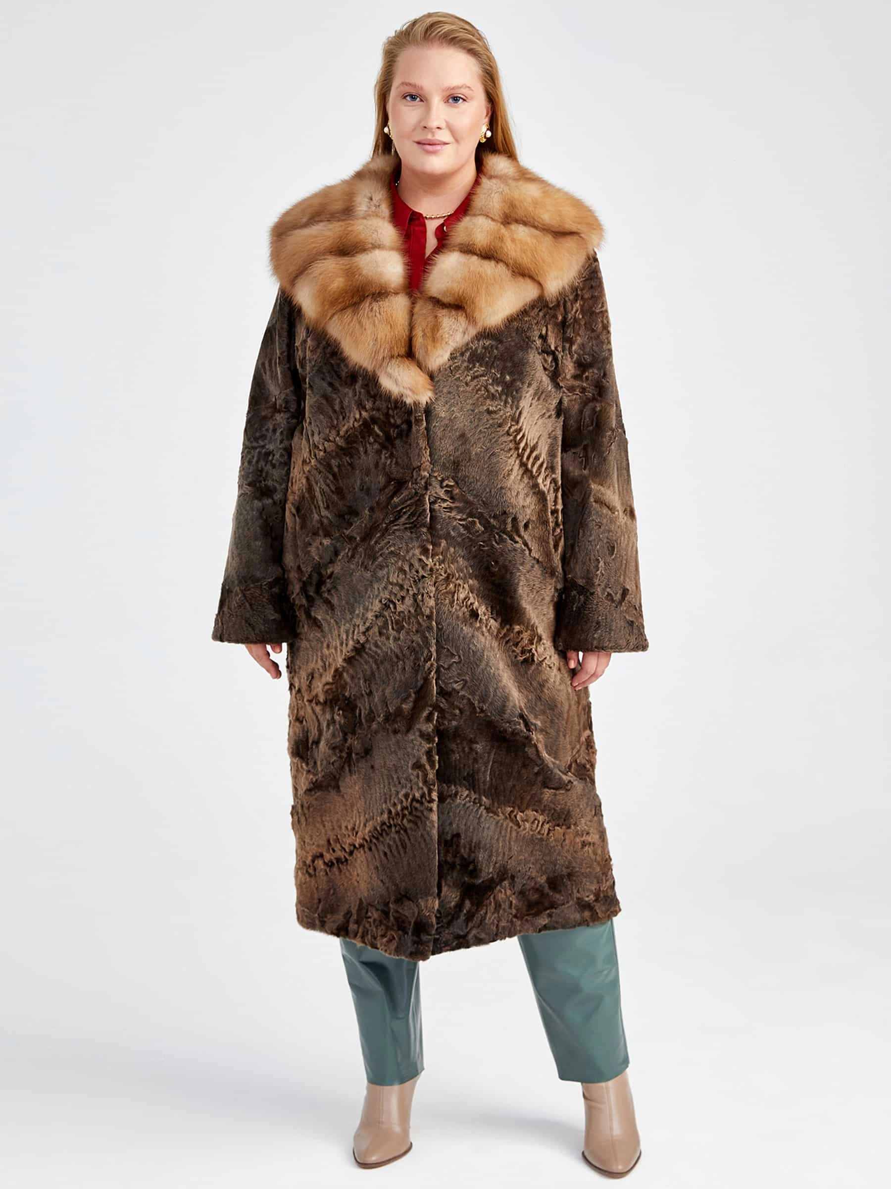 Шуба женская из меха каракуля с мехом куницы Екатерина(вк), коричневая сур, размер 54, артикул 22740