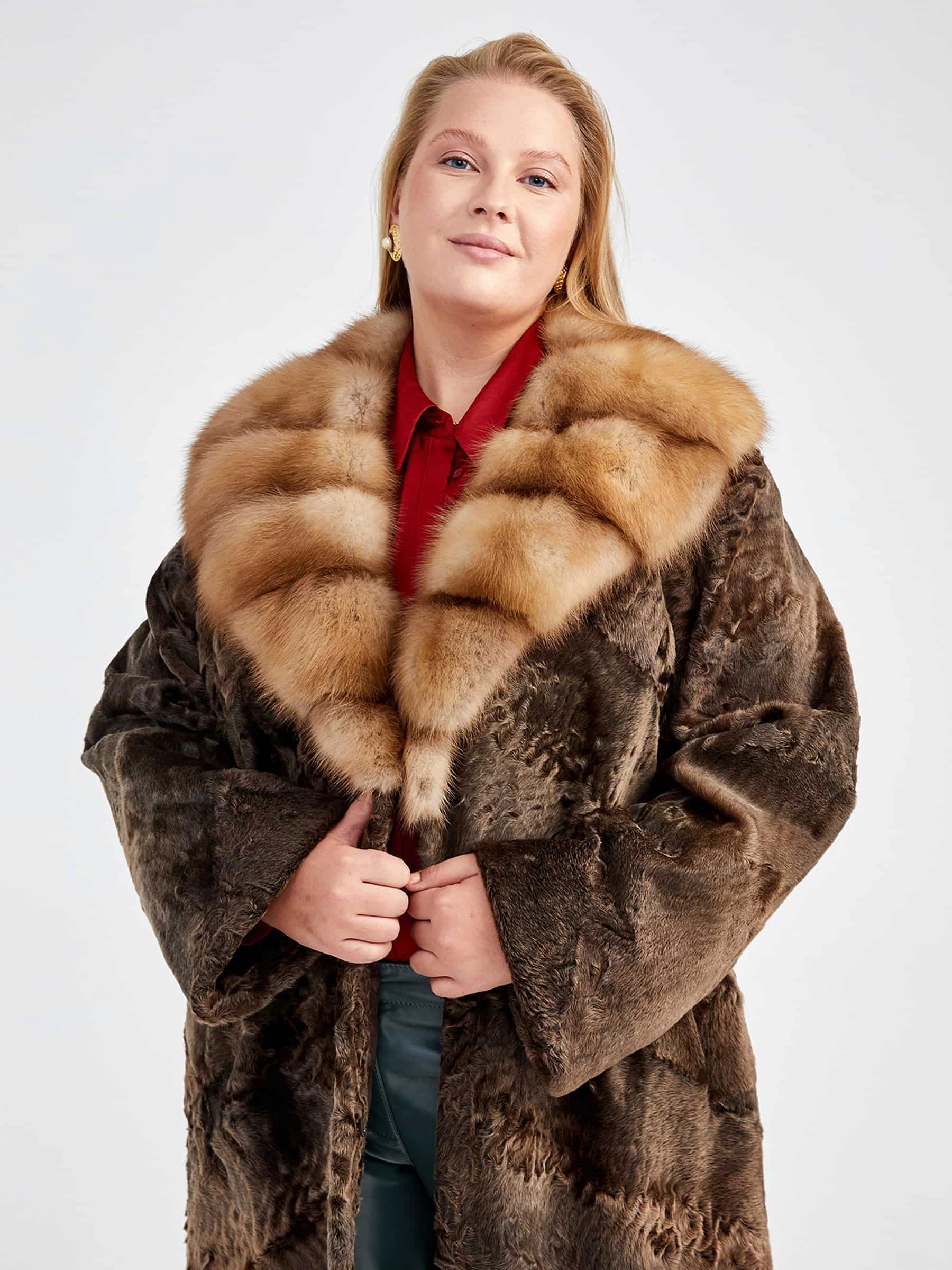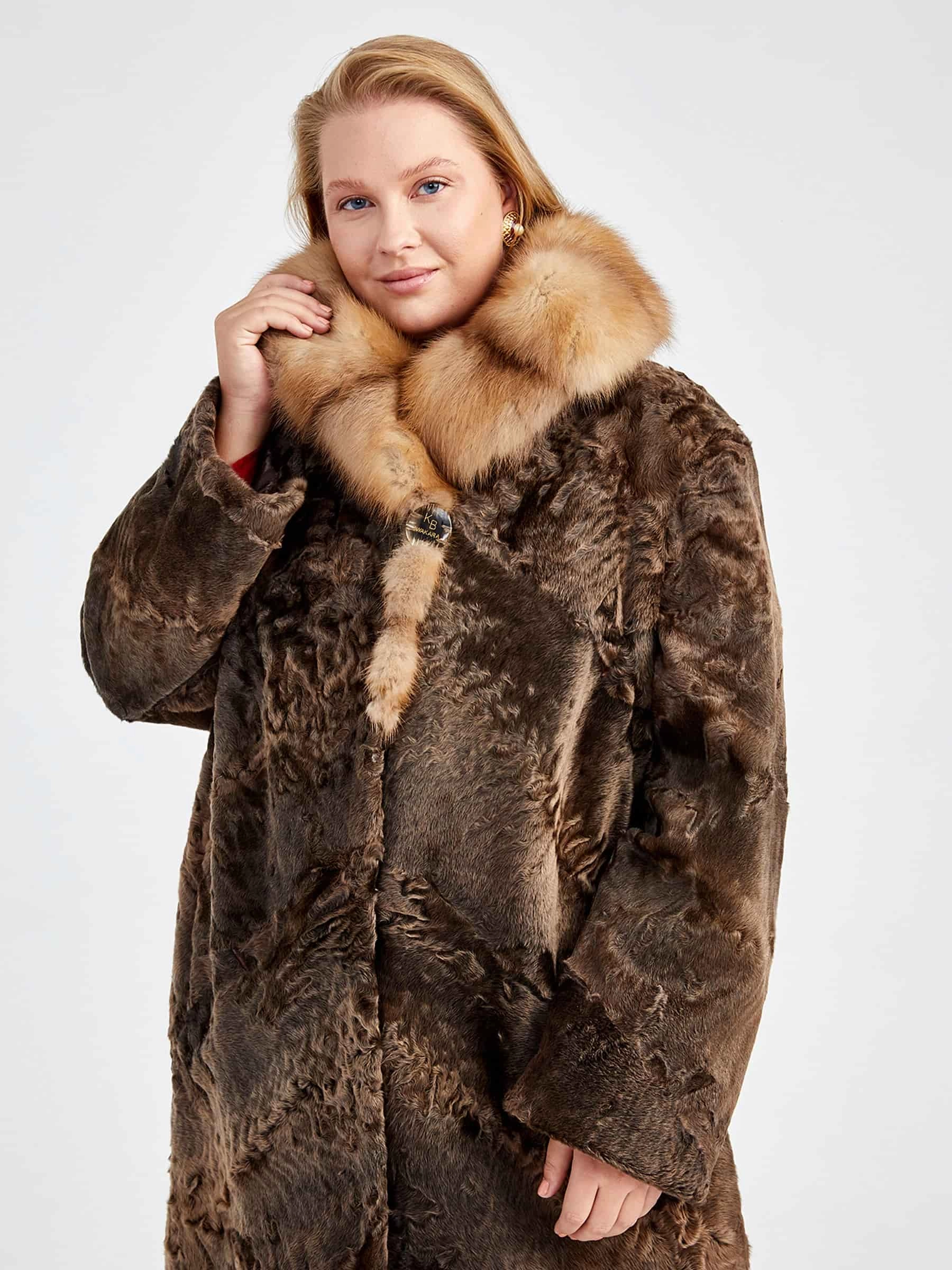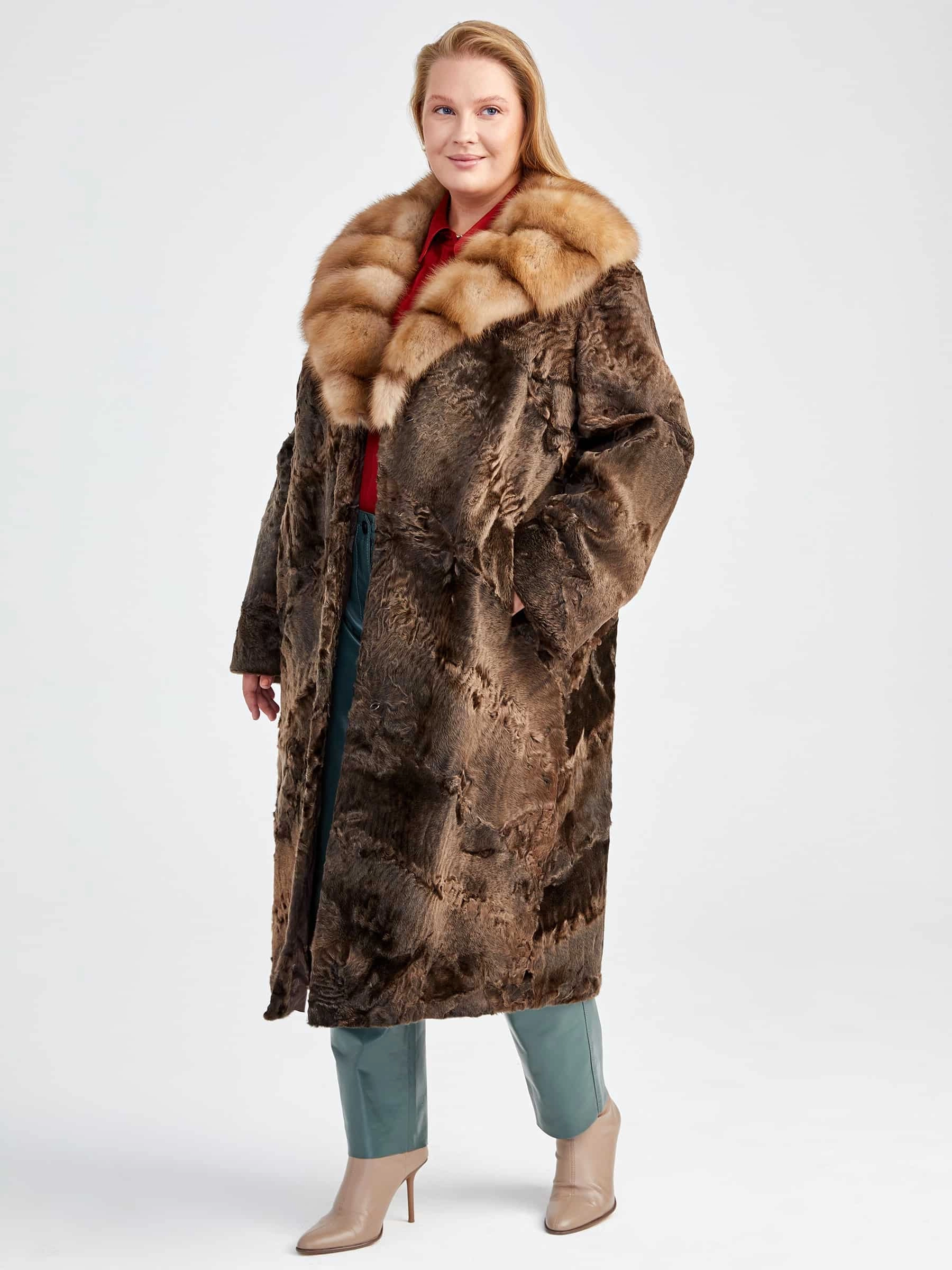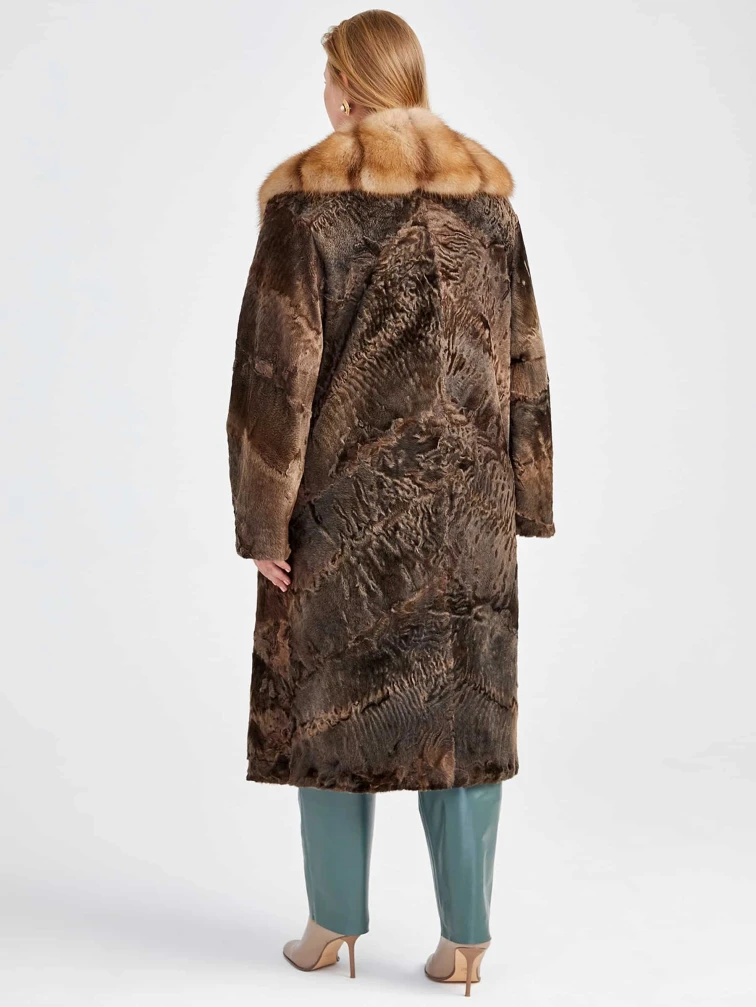 Пальто из афганской каракульчи в цвете сур. Точно подобранный рисунок. Высокое качество меха. Воротник из меха куницы. Ювелирный подбор шкурок по оттенку и структуре волоса. Аккуратная работа портных. Чёткая посадка по фигуре.