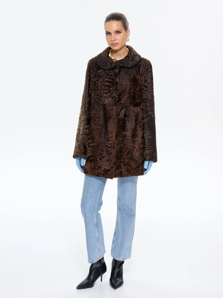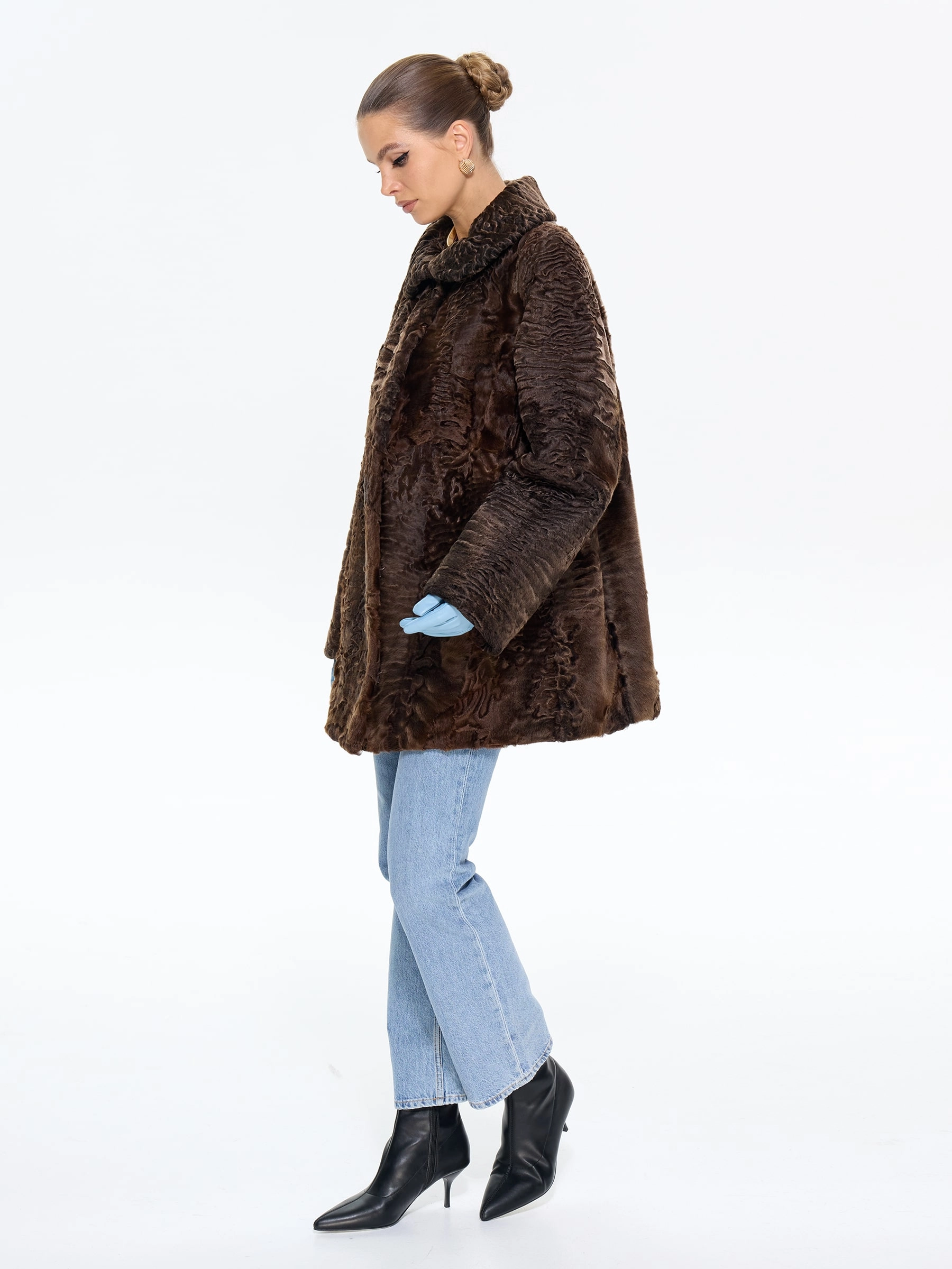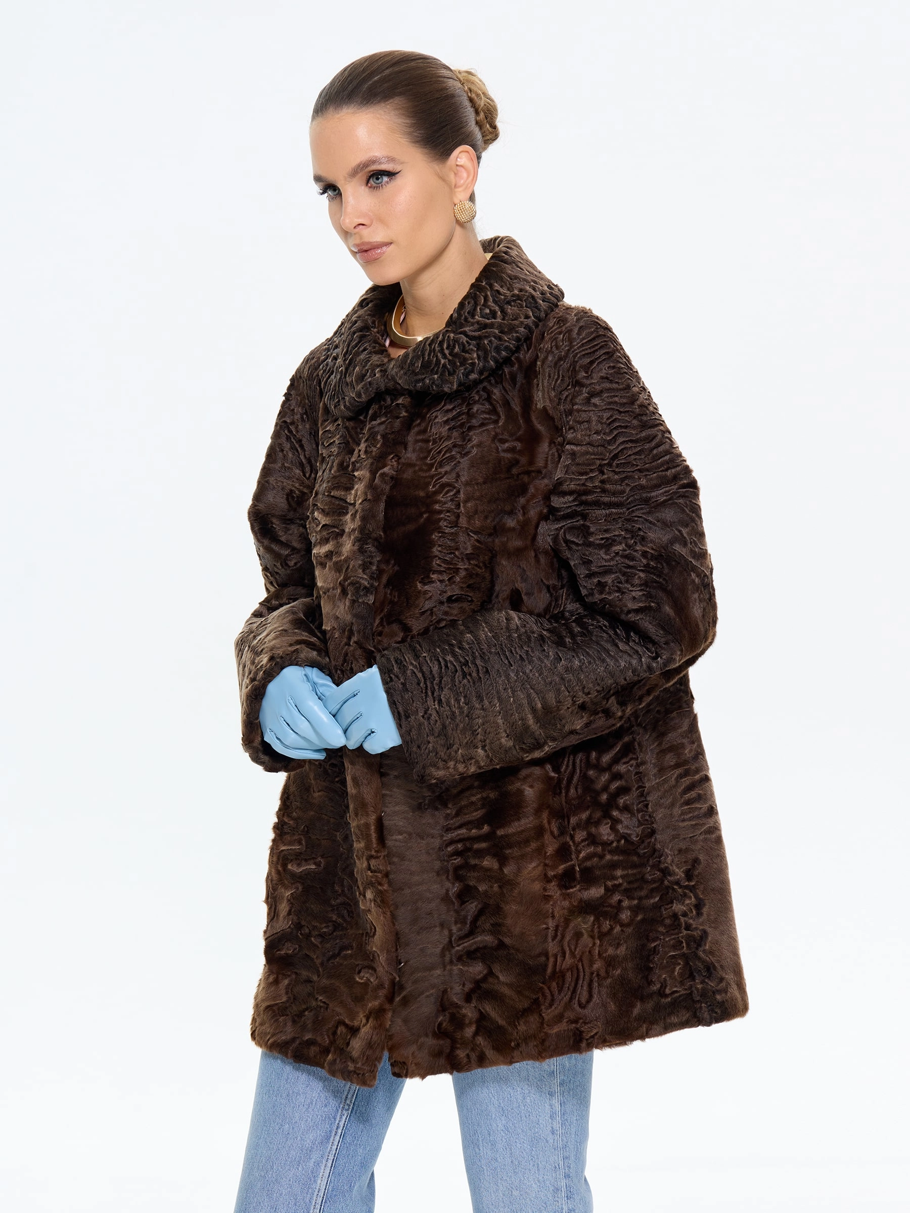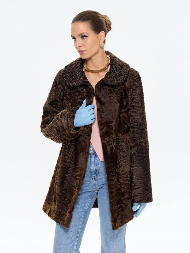 Женская шуба из меха каракульчи Елизавета, коричневая, размер 56, артикул 65590