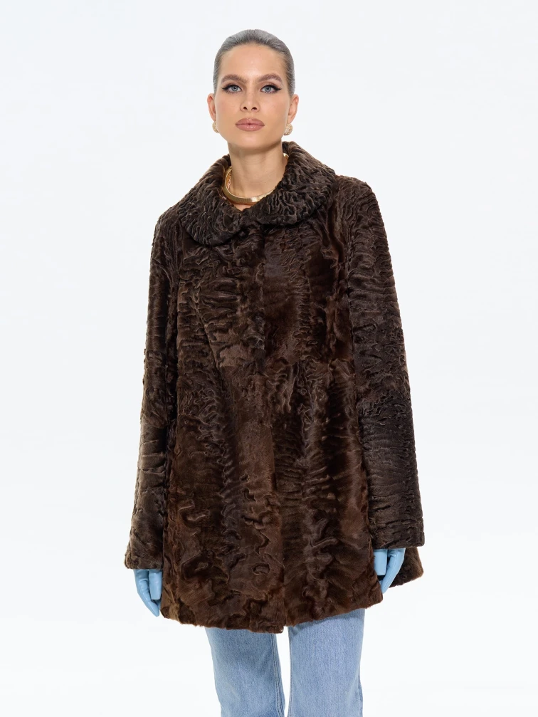 Товар женская шуба из меха каракульчи елизавета, коричневая, размер 56, артикул 65590 выполнен из мех каракульчи с застежкой клипсы. Рассчитан на сезон: весна-осень. Длина изделия 80 см, силуэт расклешенный.