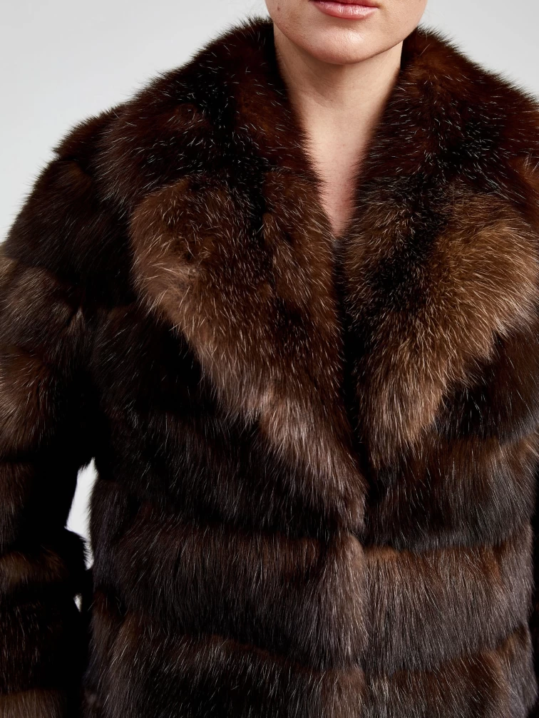 Эффектная шуба из меха соболя. Английский воротник. Горизонтальная раскладка меха. Способность сохранять тепло за счет очень плотного густого подшерстка, мягкого и шелковистого на ощупь. Шуба невероятно легкая и комфортная! Безупречный подбор меха. Премиальное качество.
