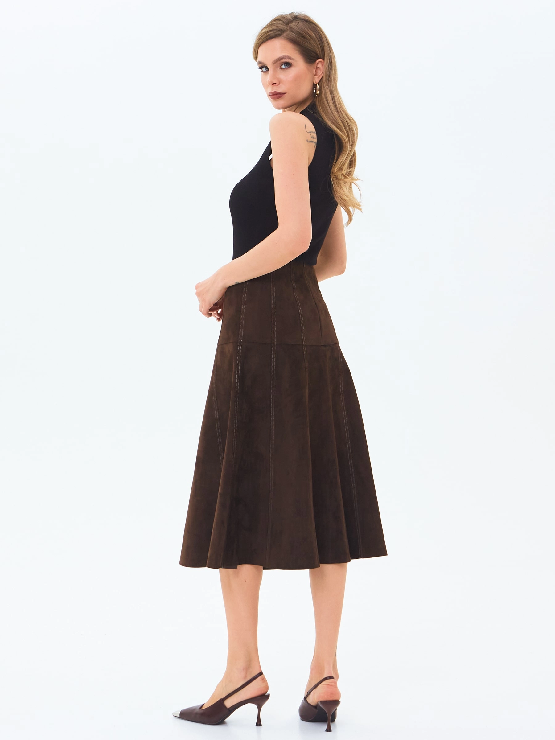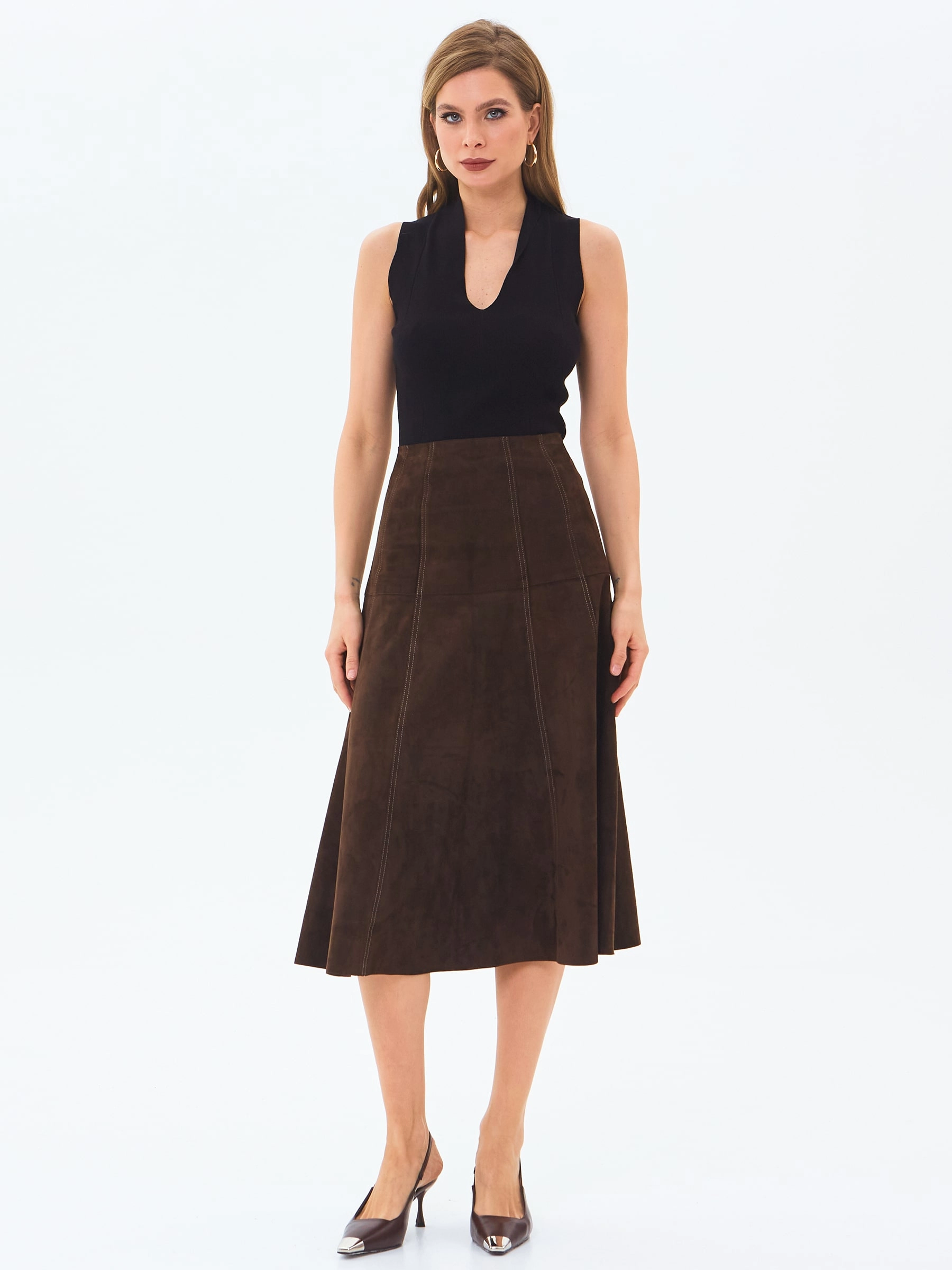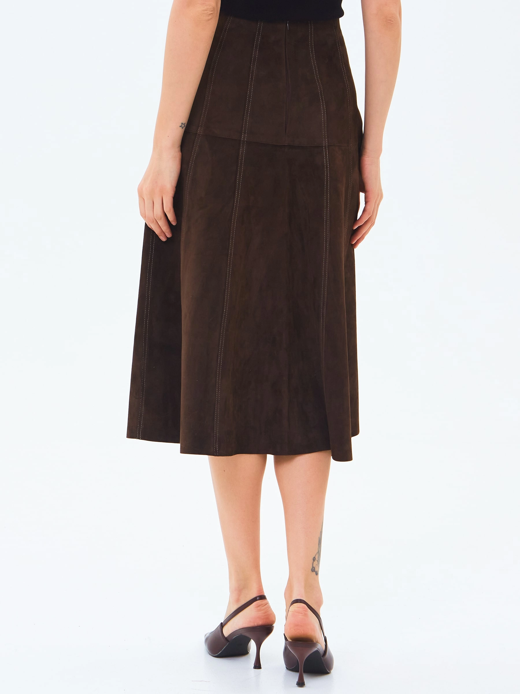 Юбка-миди из мягкой натуральной замши в насыщенном коричневом цвете сочетает полуприлегающий крой с элегантным клешем. Потайная застежка добавляют модели изысканности, а универсальный оттенок делает ее идеальной для создания разных образов — от повседневных с объемными свитерами до вечерних с шелковыми блузами. Качественная замша гарантирует комфорт и долговечность.