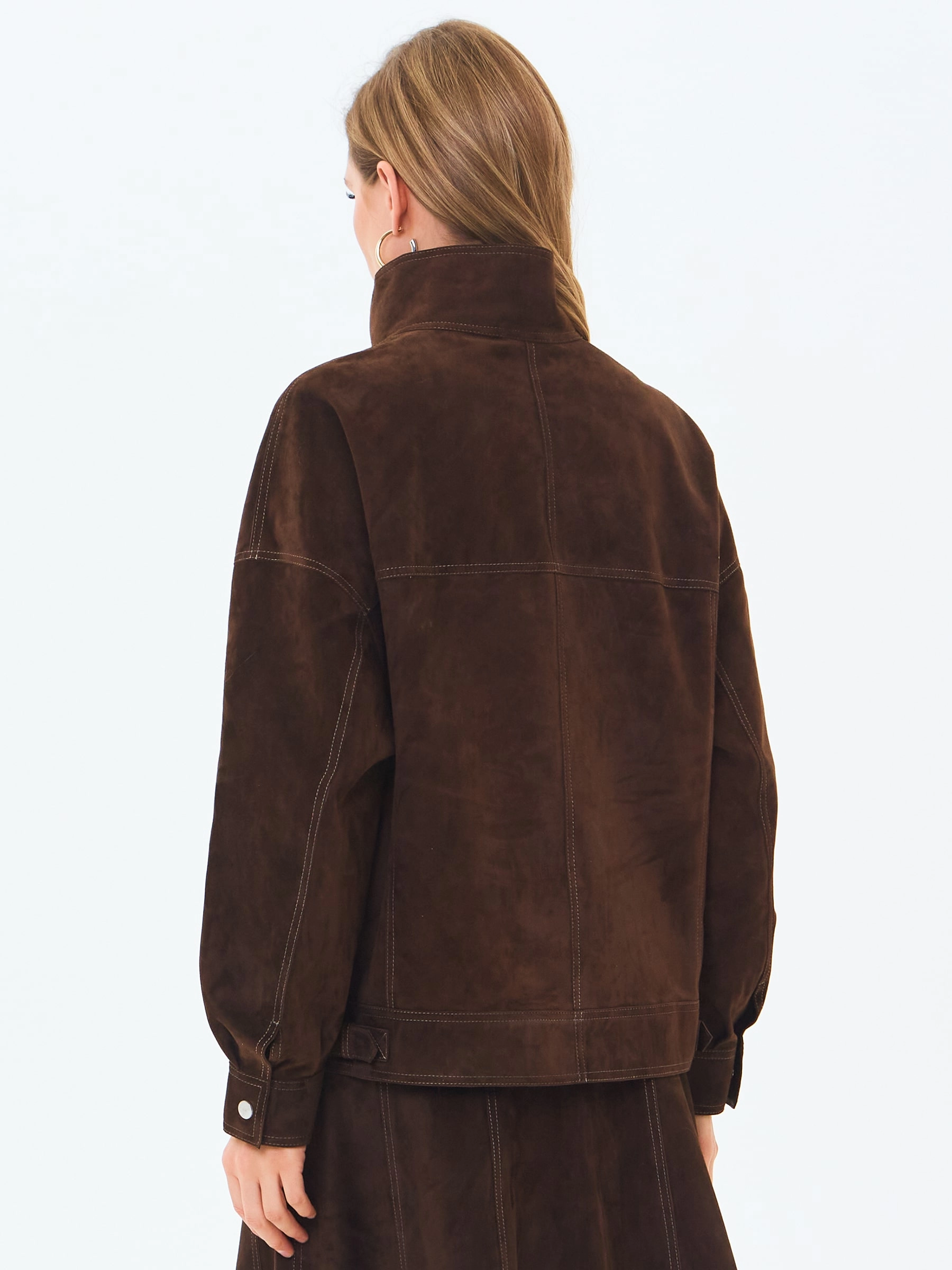 Куртку свободного силуэта со спущенной линией плеча выполнили из пластичной мягкой замши премиум класса. На поясе изделия предусмотрены регулируемые боковые паты. Модель без подклада с врезными карманами подчеркнули контрастной строчкой. Застежка- молния.
