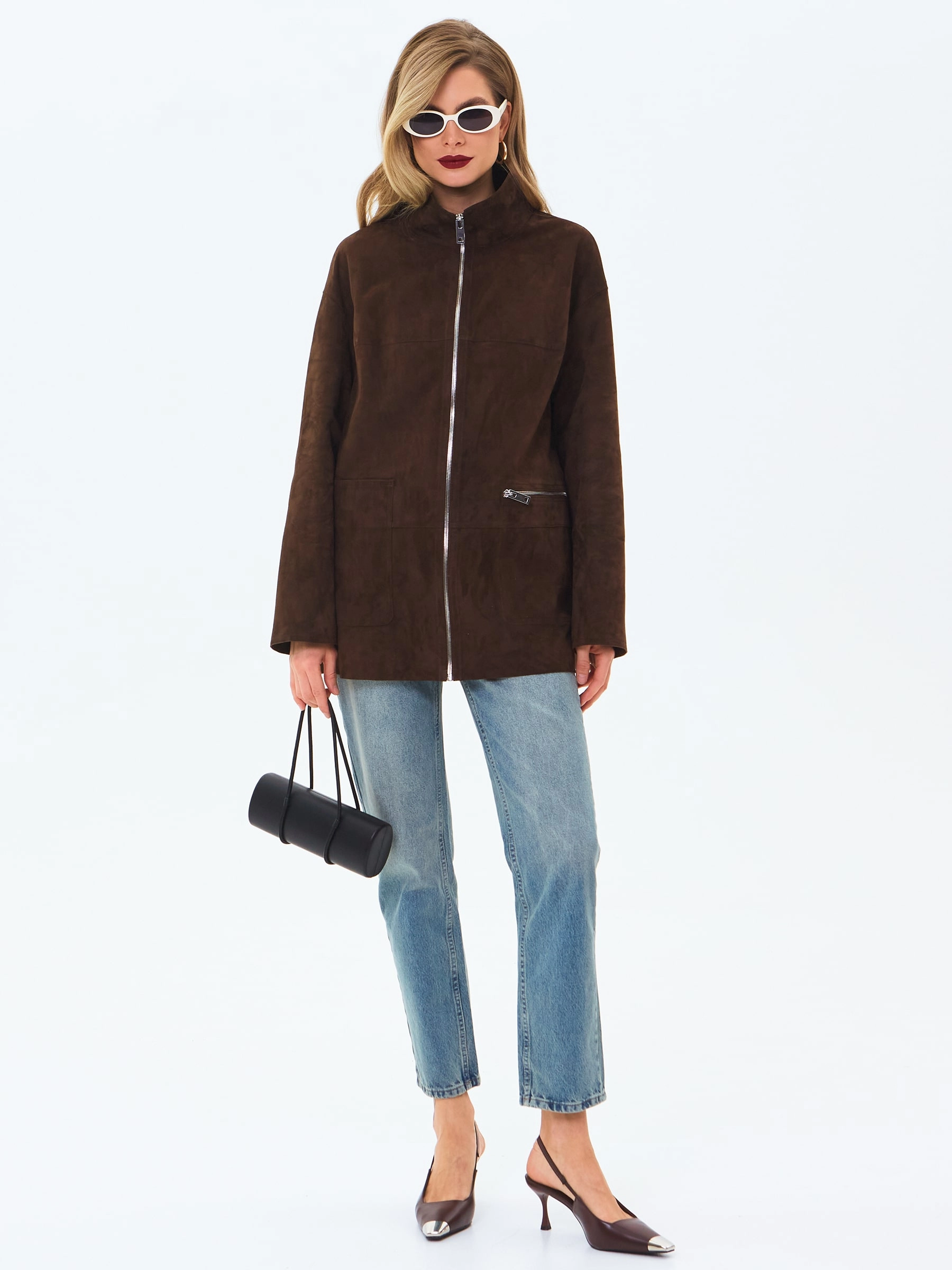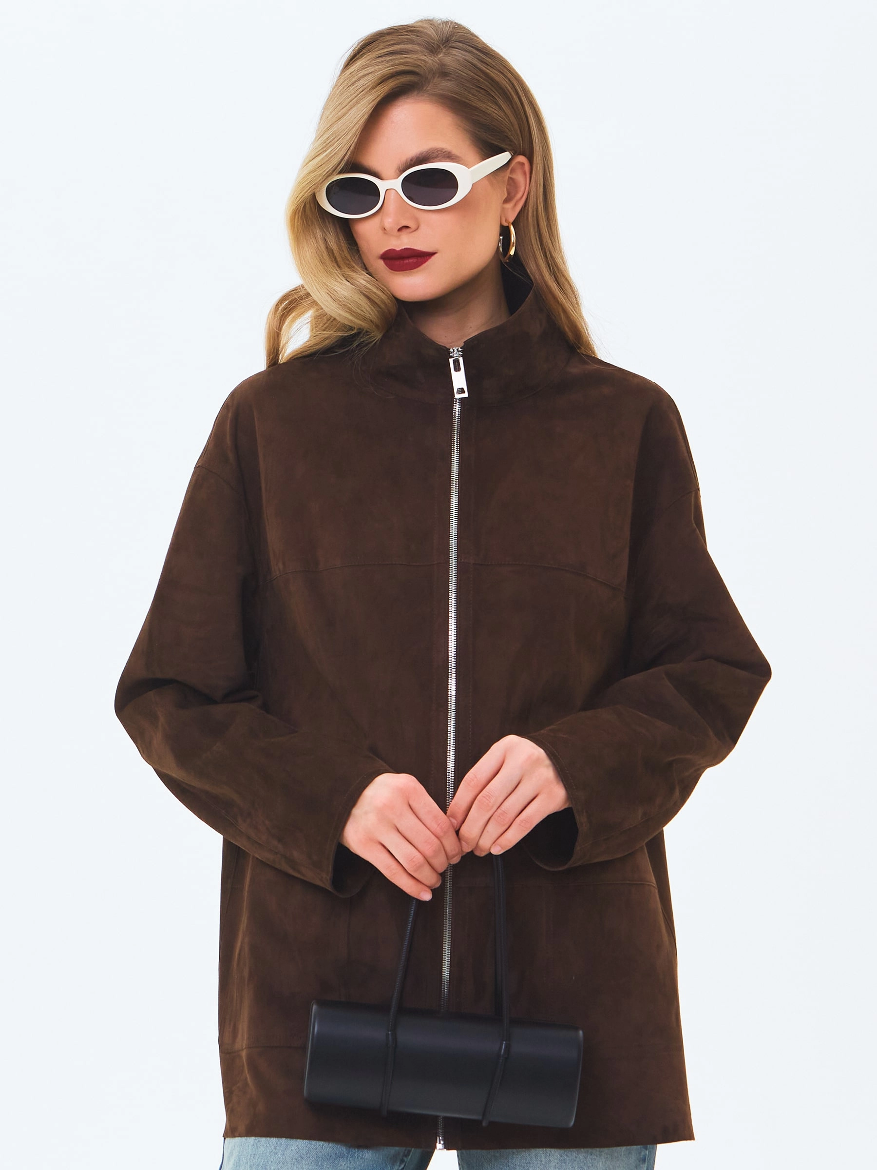 Удлиненную куртку со спущенной линией плеча и воротником- стойка, выполнили из мелкозернистой замши премиум класса. Модель свободного кроя дополнили двумя накладными карманами. Изделие застегивается крупной двухзамковой молнией.