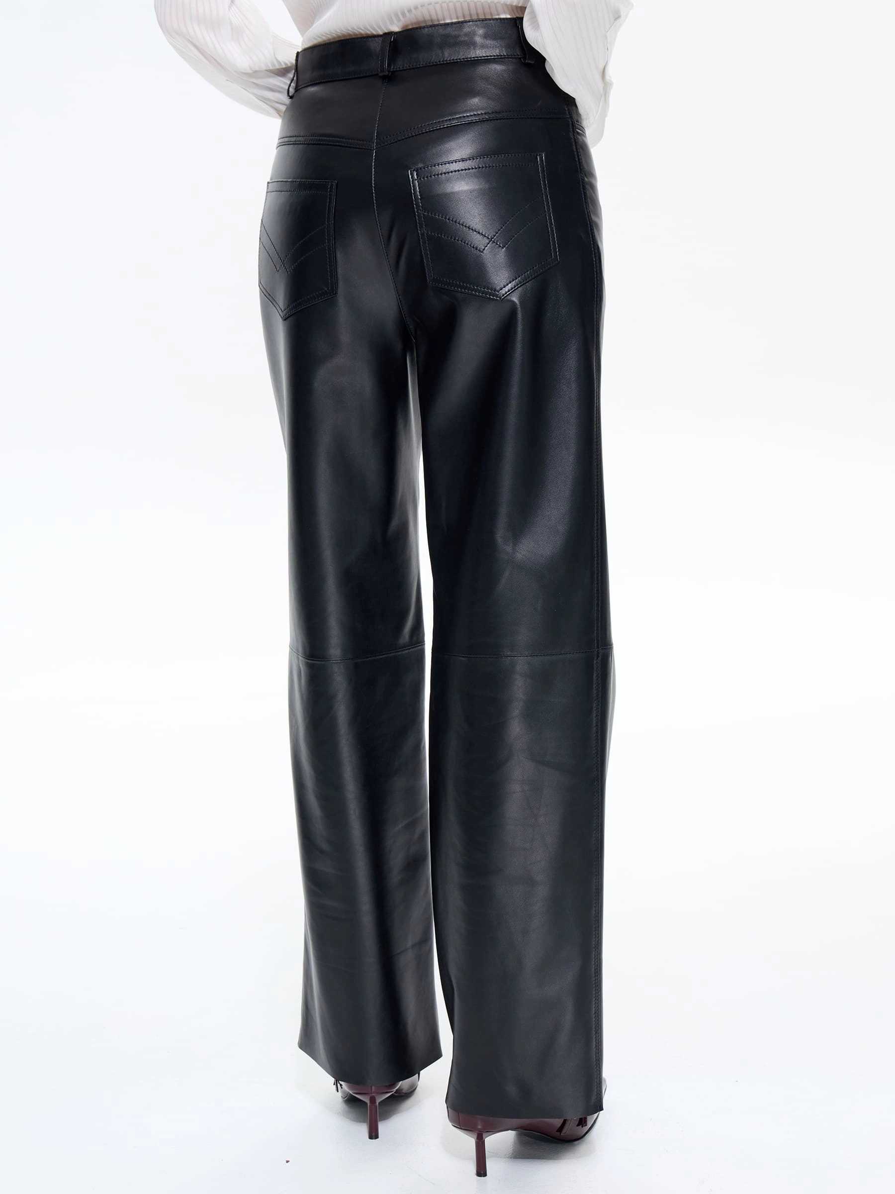 Женские кожаные брюки прямого кроя из натуральной глянцевой овечьей кожи черного цвета сочетают в себе комфорт и элегантность. Завышенная талия визуально удлиняет ноги, подчеркивает женственный силуэт и корректирует линию живота, а свободное облегание в области бедер и коленей обеспечивает легкость движений. Практичность модели дополняют четыре функциональных кармана, а универсальный дизайн позволяет создавать стильные образы как с кроссовками и балетками, так и с каблуками. Застежка на молнию гарантирует удобство носки, а высококачественная натуральная кожа с матовой фактурой подчеркивает безупречный вкус и статусность обладательницы.