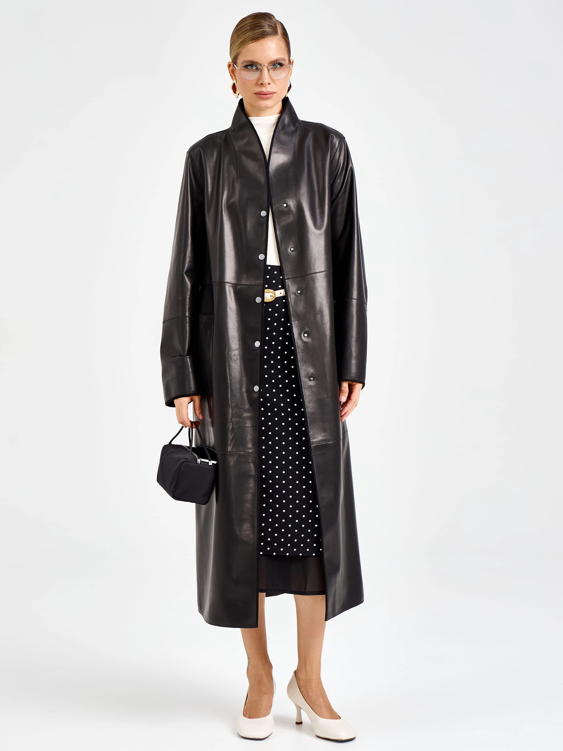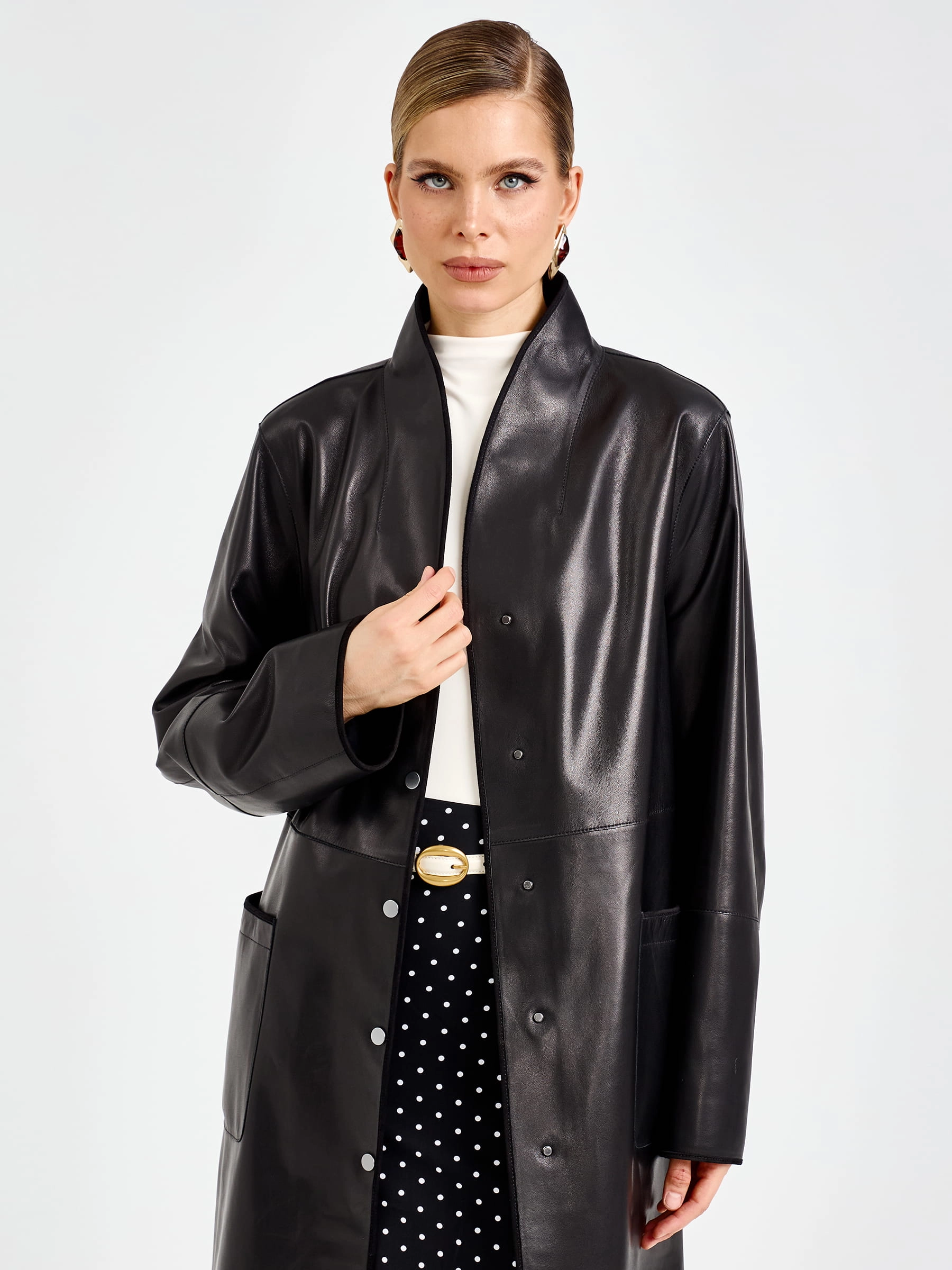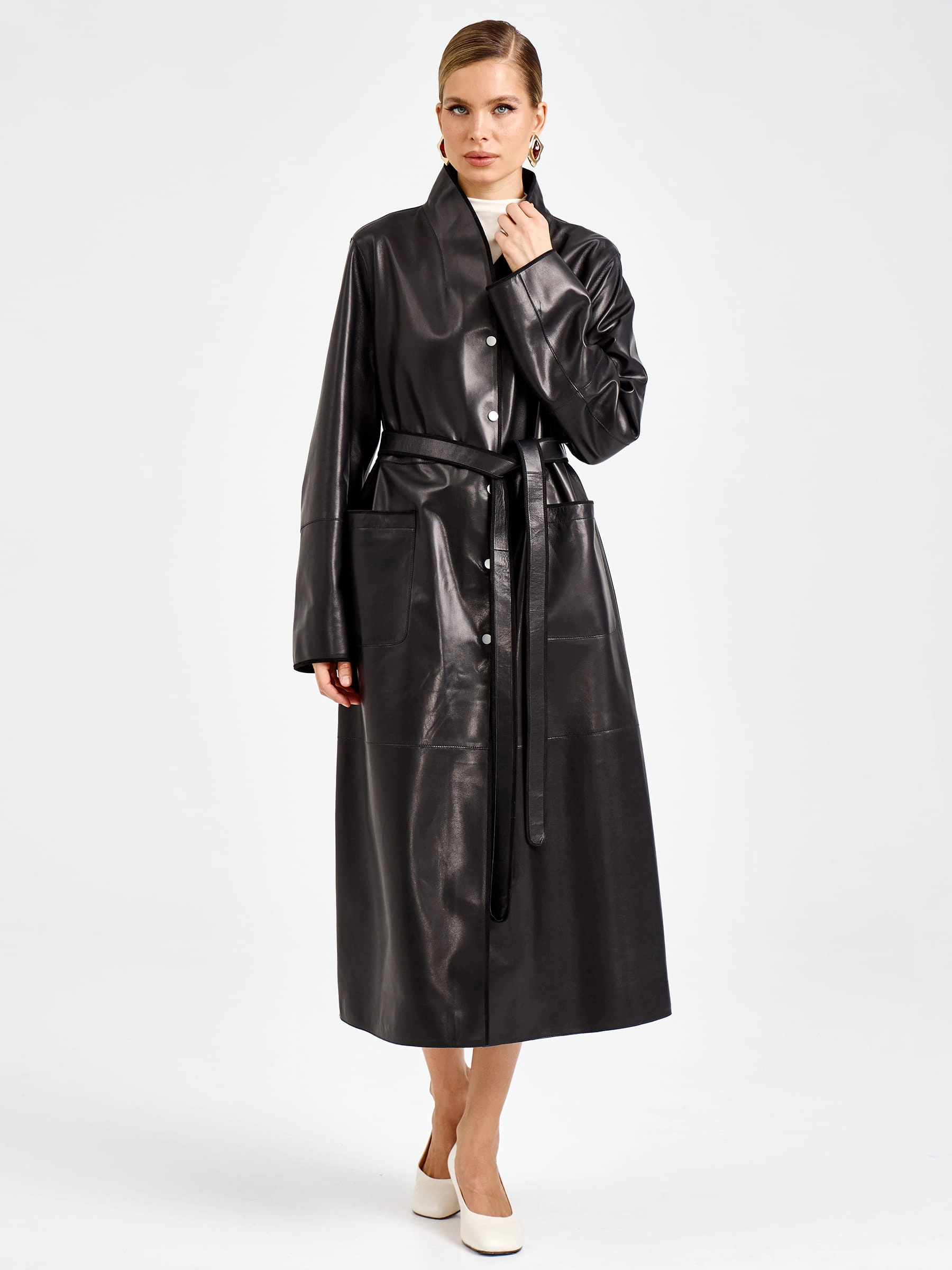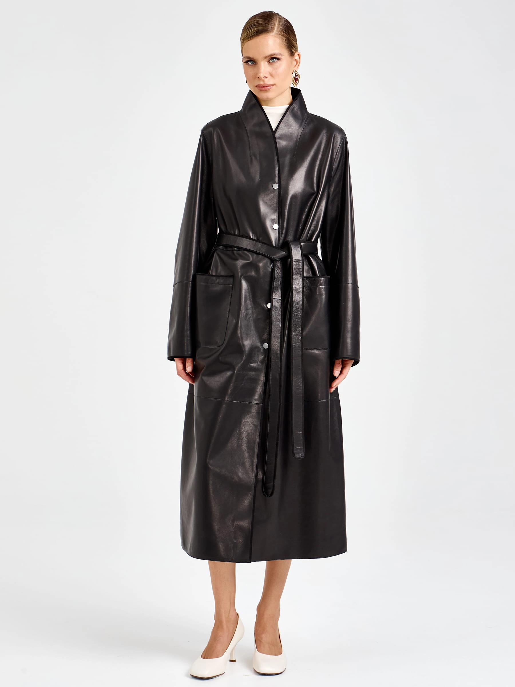 Этот длинный плащ из натуральной кожи премиум-класса длиной 125 мгновенно приковывает взгляд своим благородным силуэтом. Прямой крой с модным спущенным рукавом создает расслабленную классику, а мягкий шалевый воротник и боковые накладные карманы подчеркивают безупречный вкус. Главная изюминка модели — изысканная отделка рукавов замшевым кантом: этот контраст фактур добавляет образу глубину и делает плащ по-настоящему уникальным. Застежка на кнопках поддерживает лаконичность, а длинный пояс-лента позволяет легко менять настроение образа: от свободного прямого силуэта до изящного, подчеркивающего талию. Полное отсутствие подкладки дарит удивительную легкость и комфорт, позволяя коже дышать и мягко облегать фигуру.