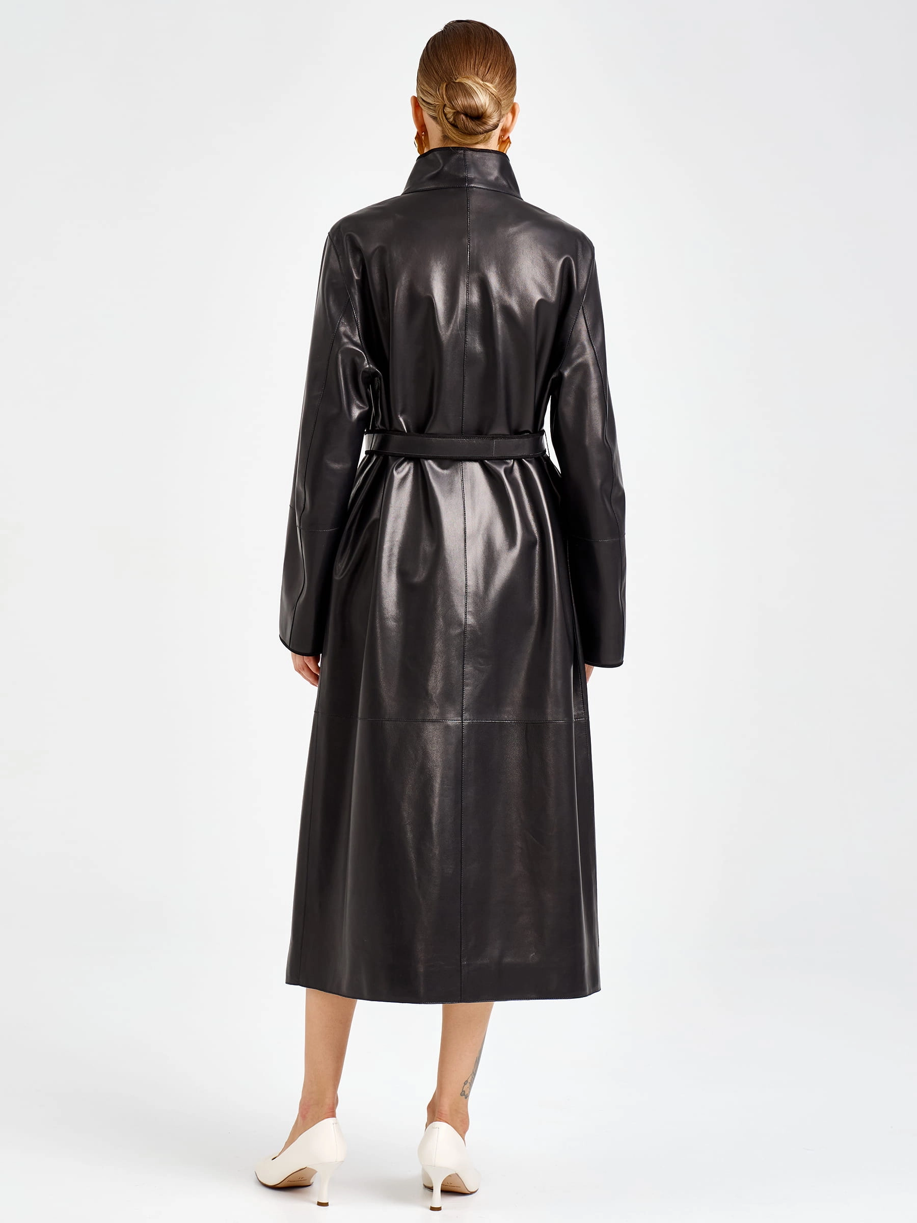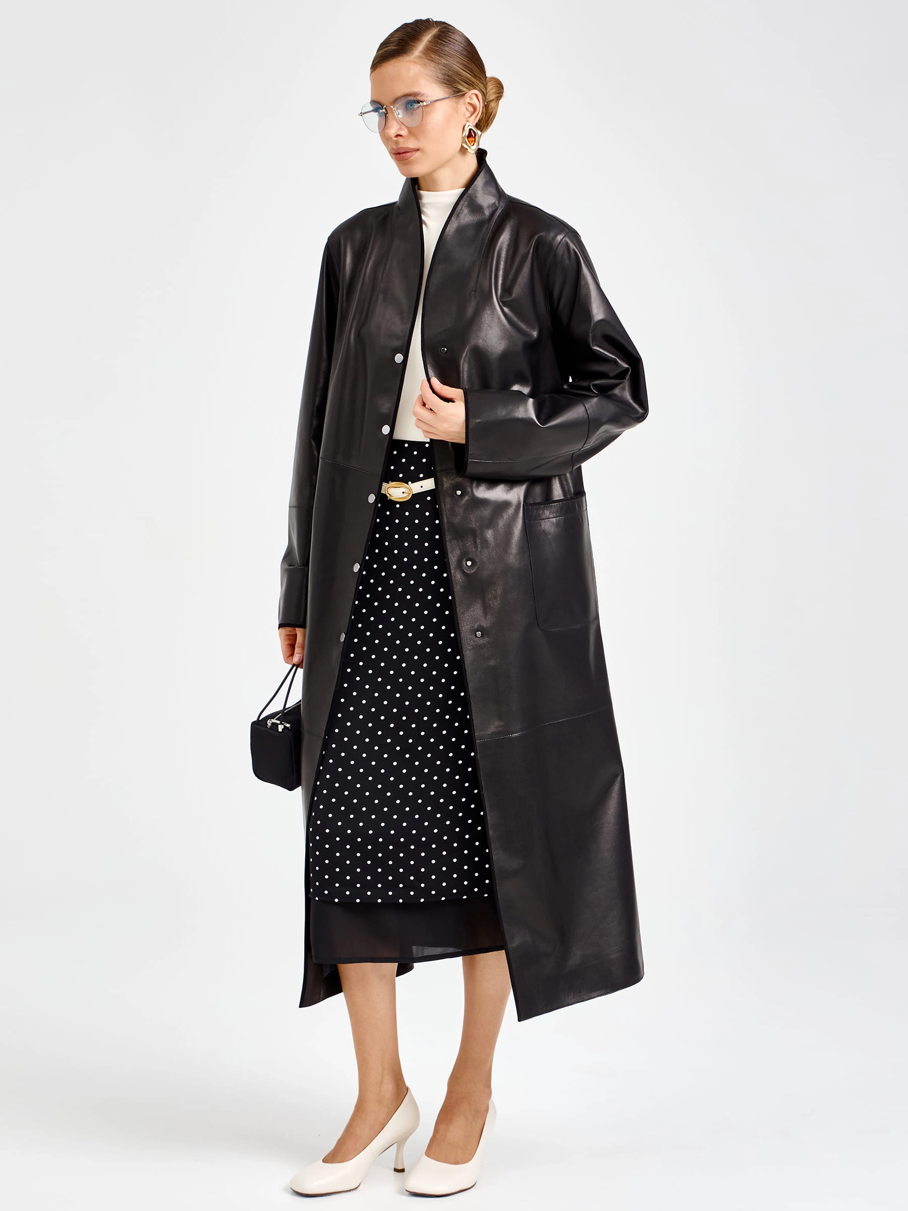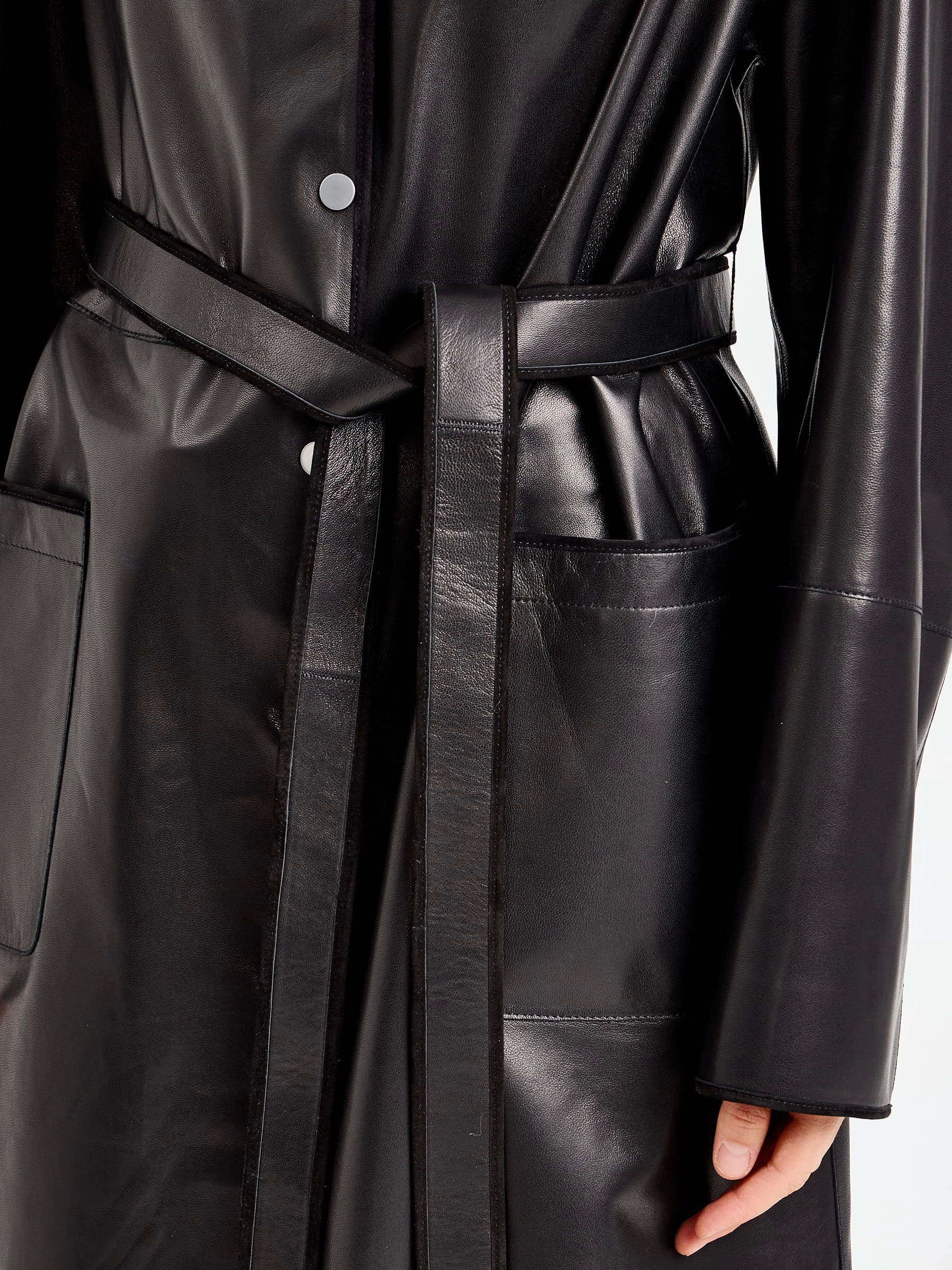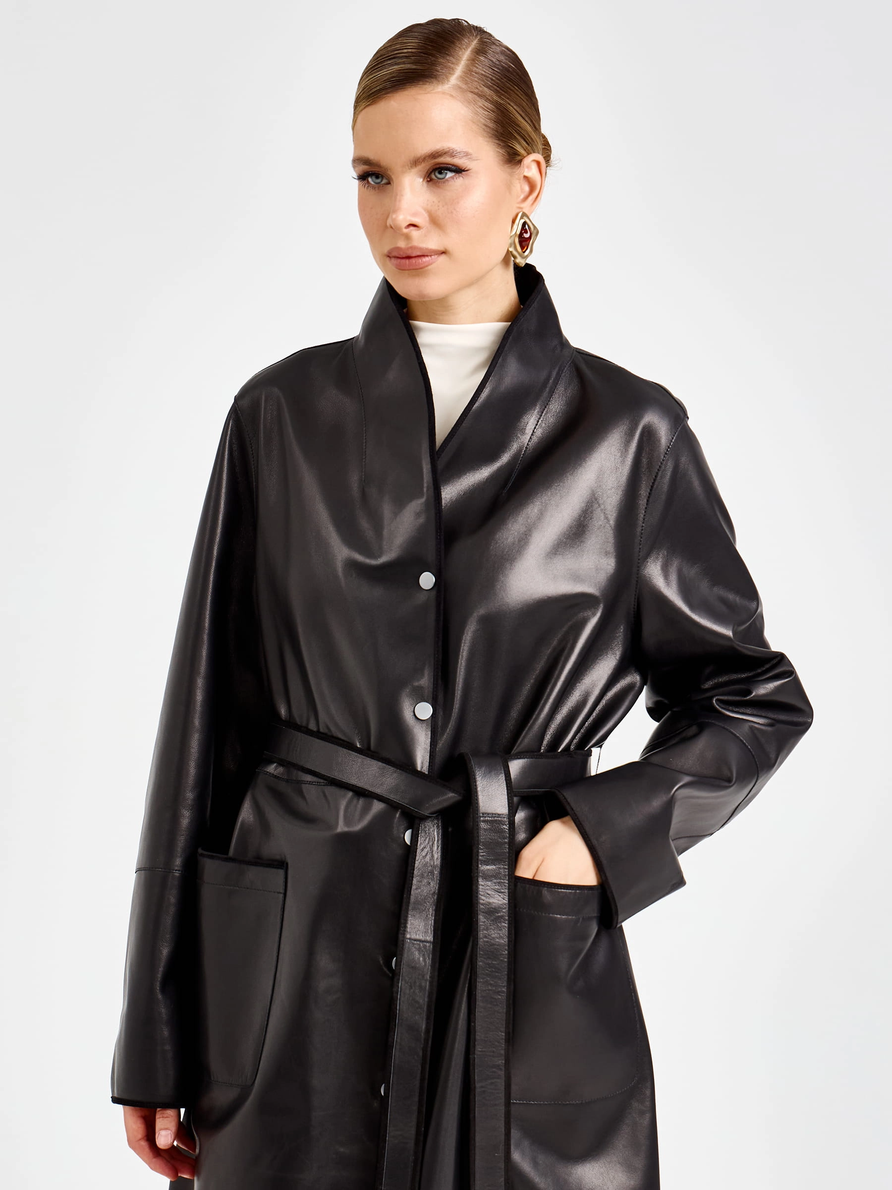 Этот длинный плащ из натуральной кожи премиум-класса длиной 125 мгновенно приковывает взгляд своим благородным силуэтом. Прямой крой с модным спущенным рукавом создает расслабленную классику, а мягкий шалевый воротник и боковые накладные карманы подчеркивают безупречный вкус. Главная изюминка модели — изысканная отделка рукавов замшевым кантом: этот контраст фактур добавляет образу глубину и делает плащ по-настоящему уникальным. Застежка на кнопках поддерживает лаконичность, а длинный пояс-лента позволяет легко менять настроение образа: от свободного прямого силуэта до изящного, подчеркивающего талию. Полное отсутствие подкладки дарит удивительную легкость и комфорт, позволяя коже дышать и мягко облегать фигуру.