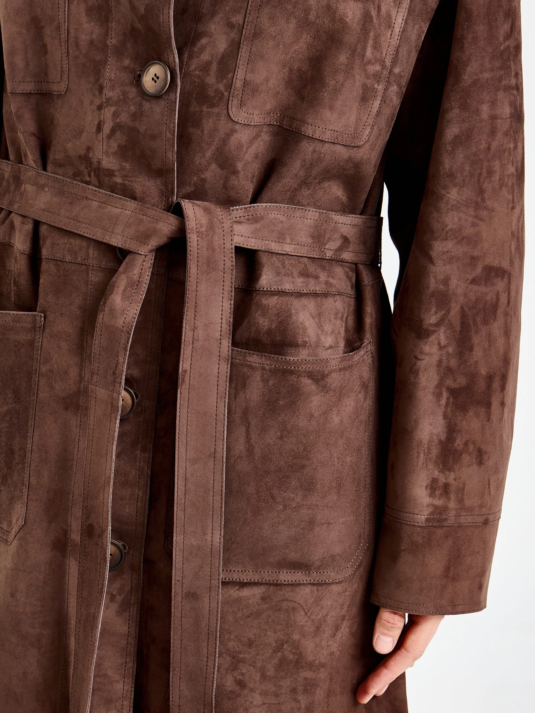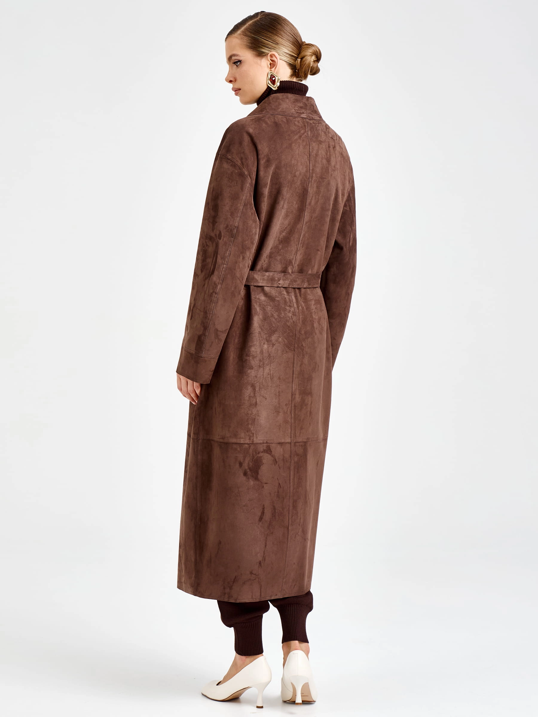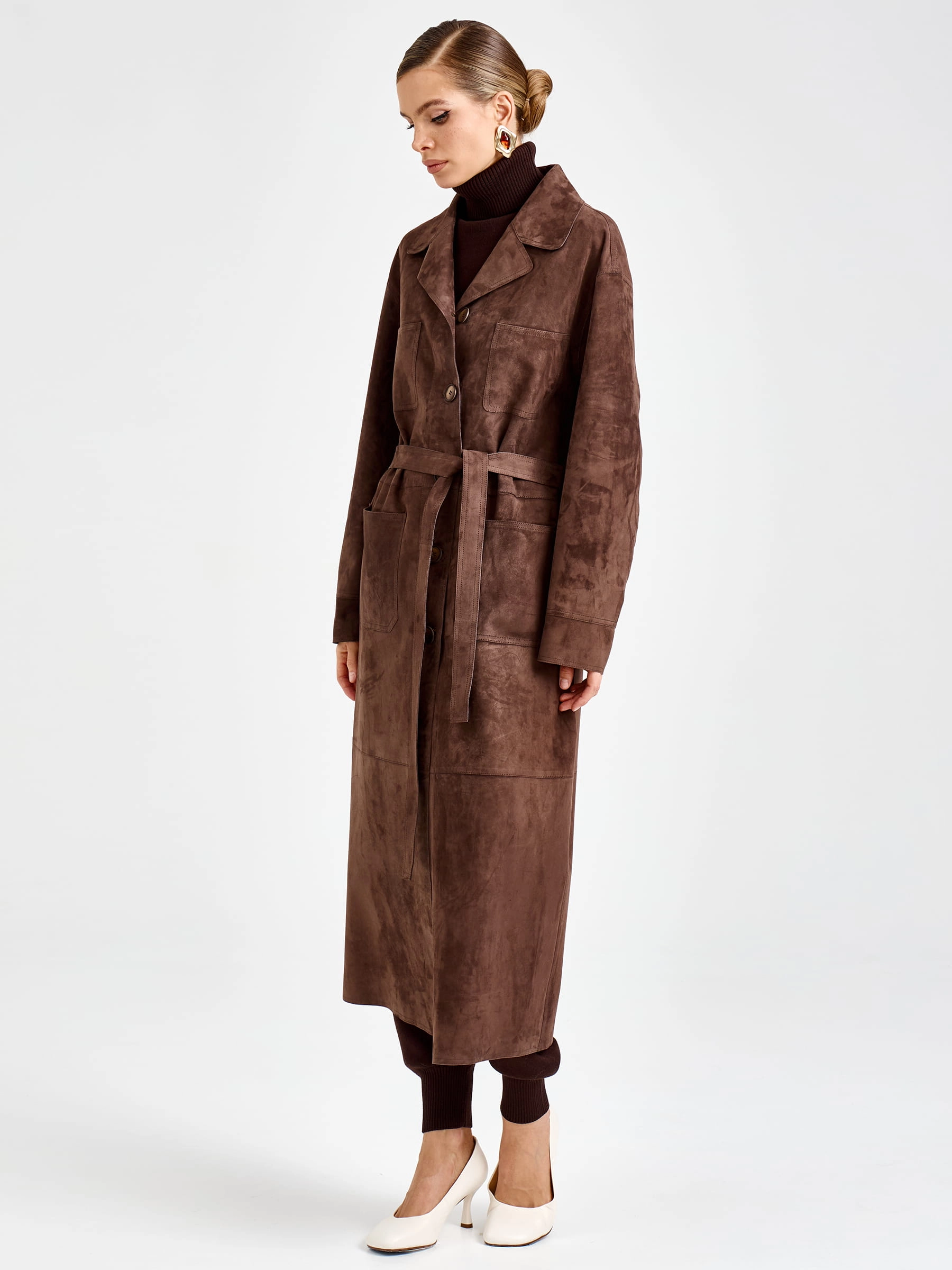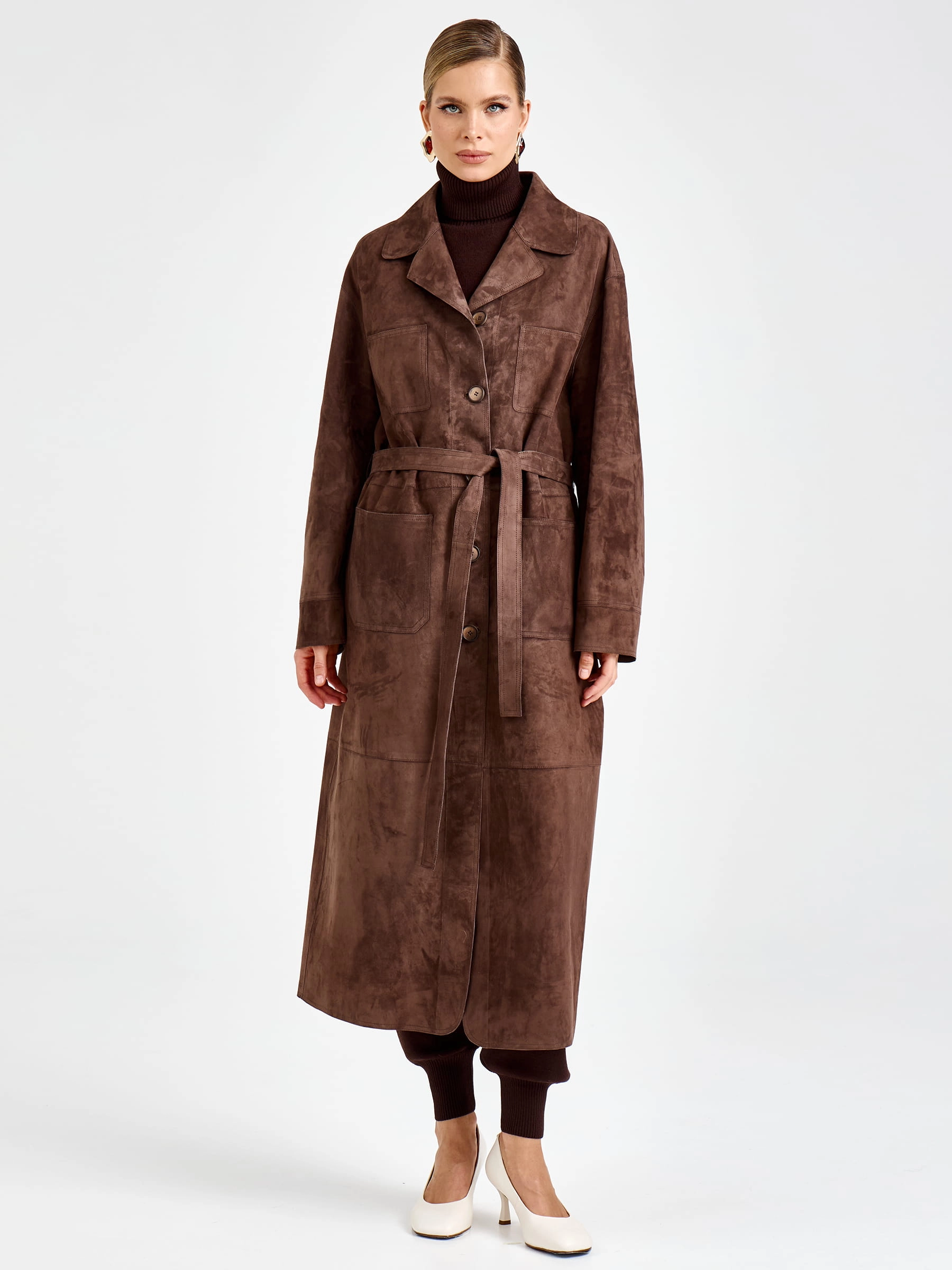 Товар женский замшевый плащ премиум класса 3112з, коричневый, размер 46, артикул 92370 выполнен из натуральной замши с застежкой кнопки. Рассчитан на сезон: весна-осень. Длина изделия 133 см, силуэт прямой.