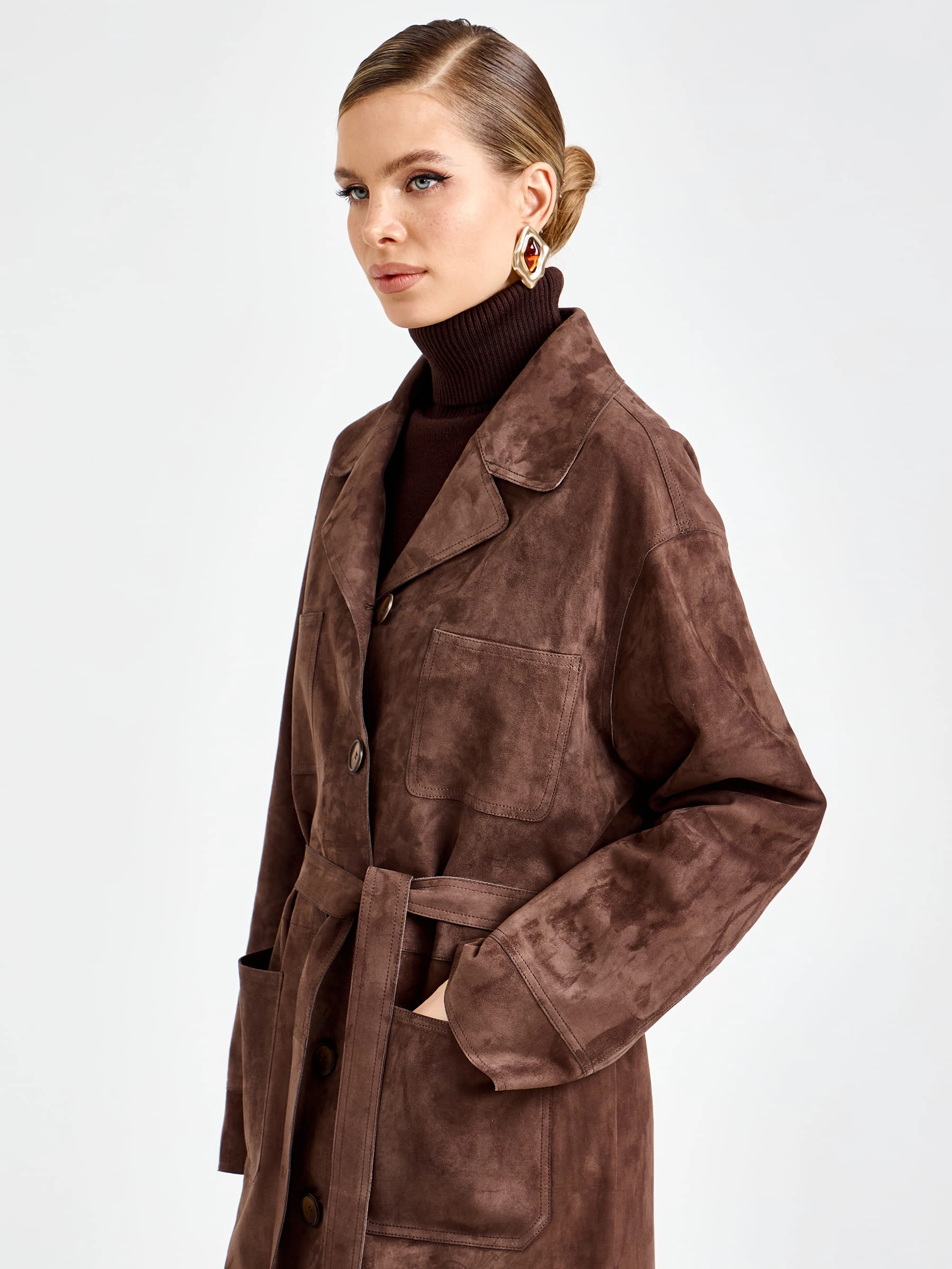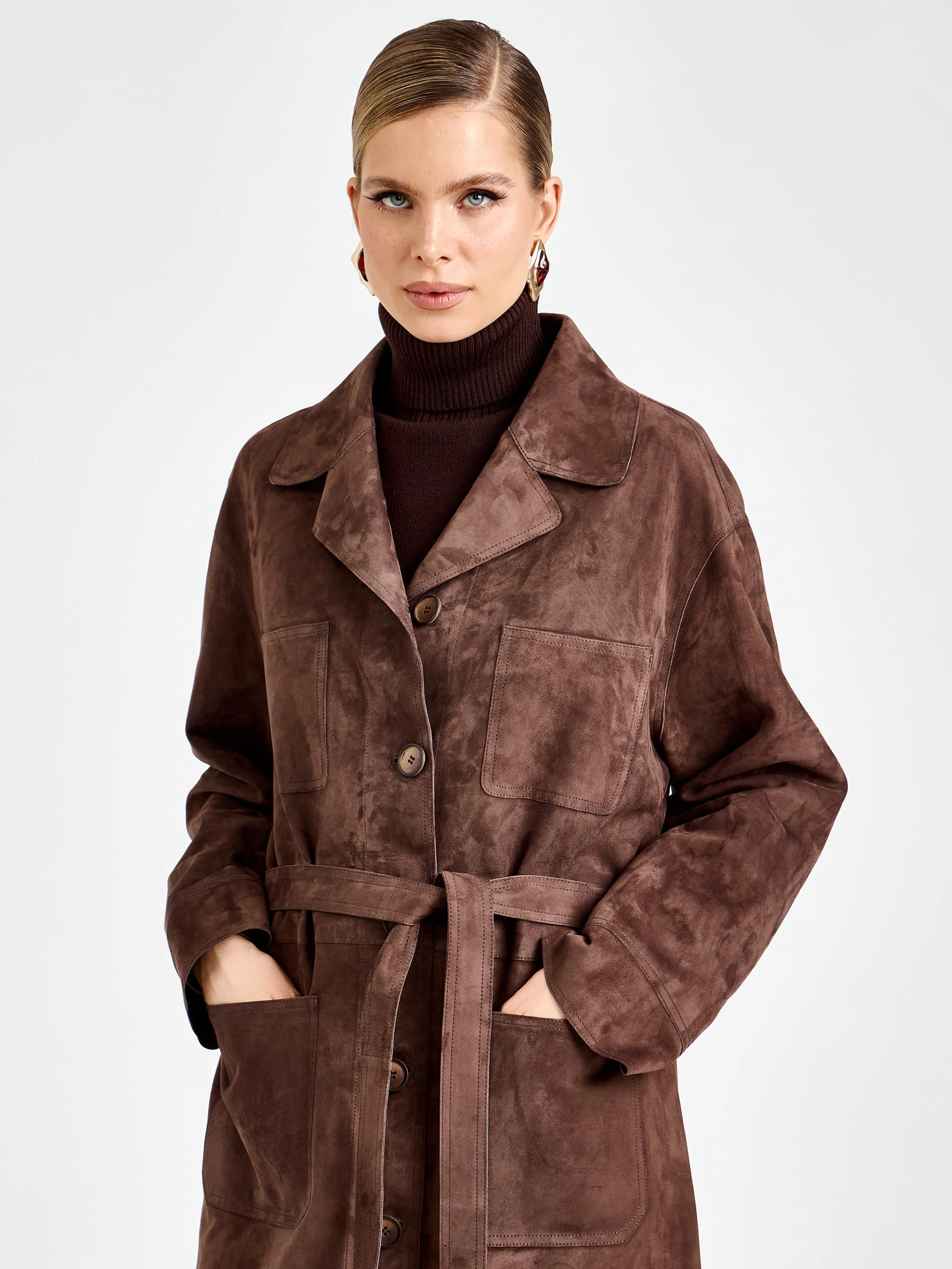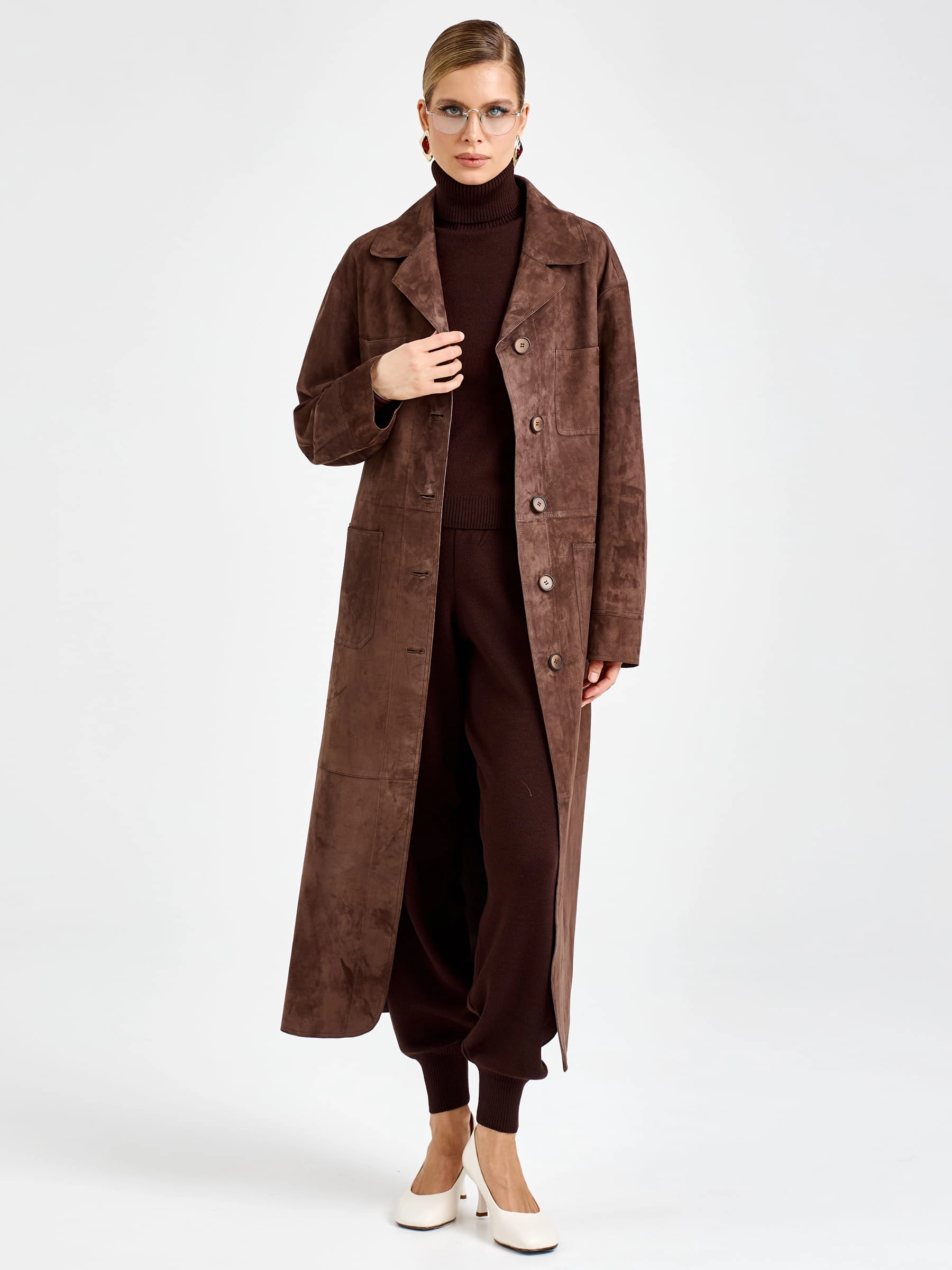 Этот роскошный длинный плащ из черной коричневой замши премиум-класса — настоящая инвестиция в ваш стиль. Прямой крой длиной 133 см с модным спущенным рукавом и классическим отложным воротником выглядит безупречно лаконично. Продуманная система карманов — два нагрудных и два боковых врезных — добавляет функциональности, не нарушая чистоты линий. Застежка на кнопках поддерживает минималистичную эстетику. Особый шик модели — полное отсутствие подкладки, благодаря чему плащ удивительно легкий, а мягкая замша прилегает к одежде с комфортом, создавая тактильно приятный и визуально дорогой образ. Но главный секрет — в трансформации: стоит завязать пояс, как струящийся прямой силуэт превращается в изящный, женственный, идеально подчеркивающий талию.