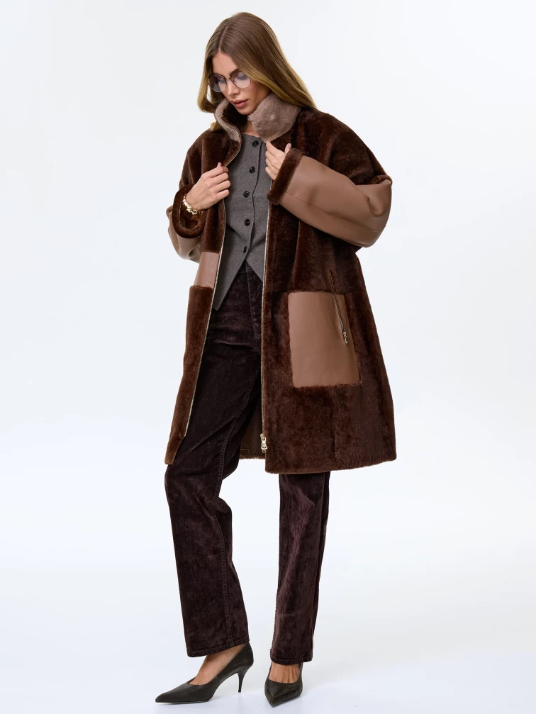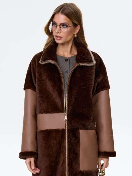 Товар женское полупальто из натуральной овчины с норковым воротником премиум класса 2038, коричневое, размер 46, артикул 64260 выполнен из овчина "мерино" с застежкой молния. Рассчитан на сезон: осень-зима. Длина изделия 95 см, силуэт прямой.