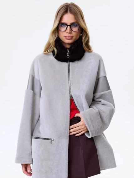 Товар женское полупальто с норковым воротником из натуральной овчины премиум класса 2057, серое, размер 44, артикул 64500 выполнен из овчина "мерино" с застежкой молния. Рассчитан на сезон: осень-зима. Длина изделия 77 см, силуэт свободный.