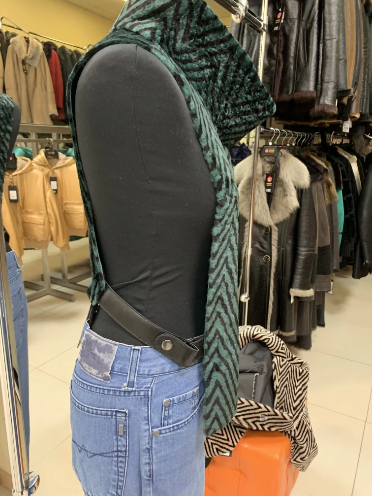 Жилет с высоким воротом выполнили из нежного меха астраган. Аксессуар надевается под любой тип пальто, отлично защищая горло и грудь от ветра. Предусмотрены боковые кожаные ремешки застегивающиеся кнопками.