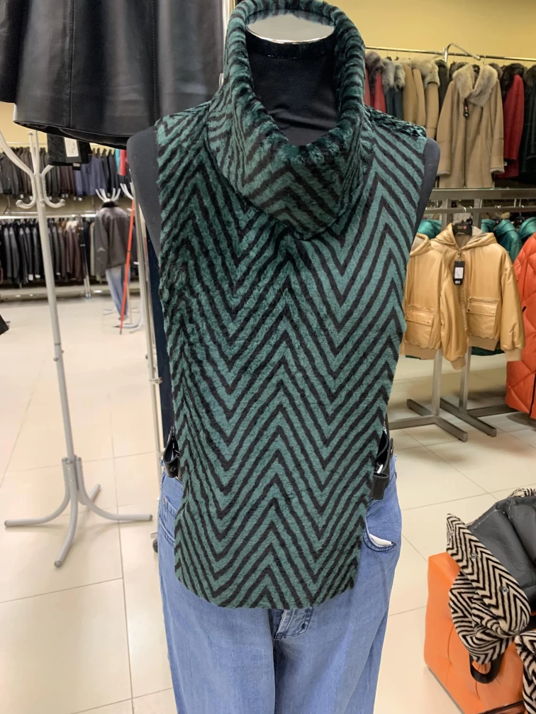 Товар жилет женский из натурального меха астраган 10, зеленый, размер 46, артикул 24400 выполнен из астраган с застежкой кнопки. Рассчитан на сезон: зима. Длина изделия 43 см, силуэт прямой.